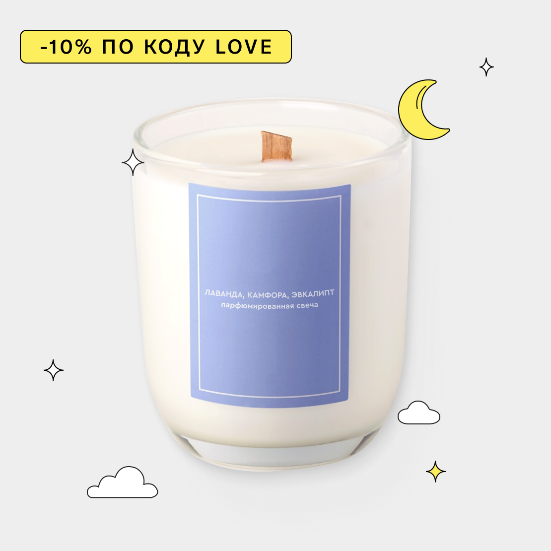 • Состав: соевый воск, деревянный фитиль, парфюмерная композиция.